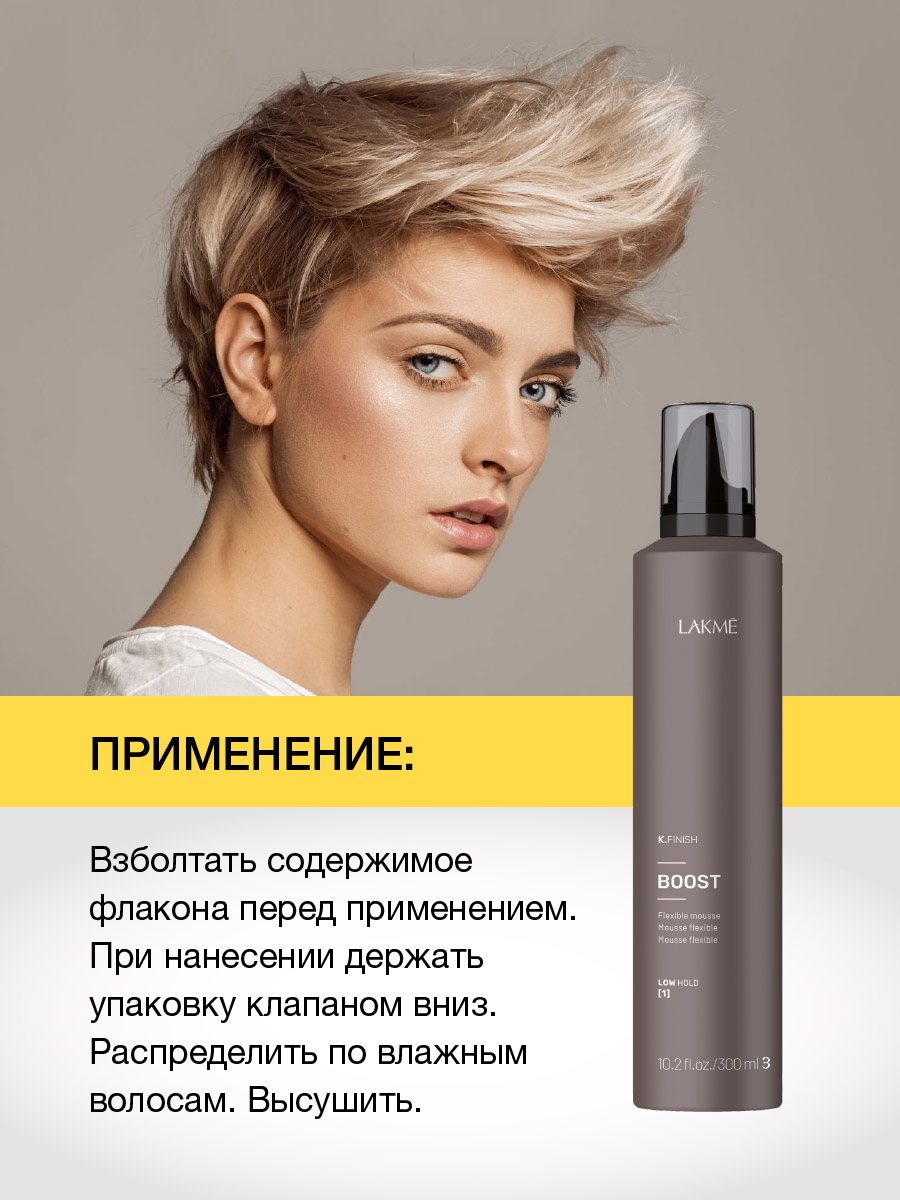 Мусс для стойкого прикорневого объема Lakme Boost Эластичная фиксация. Пружинистый прикорневой объем. Идеально подходит для тонких волос. Устойчив к влажности. Древесно — травяной аромат. Степень фиксации — 1. При нанесении держать упаковку клапаном вниз. Способ применения Нанести на влажные волосы небольшое количество мусса и высушить волосы феном. Для создания завитков уложить волосы диффузором.