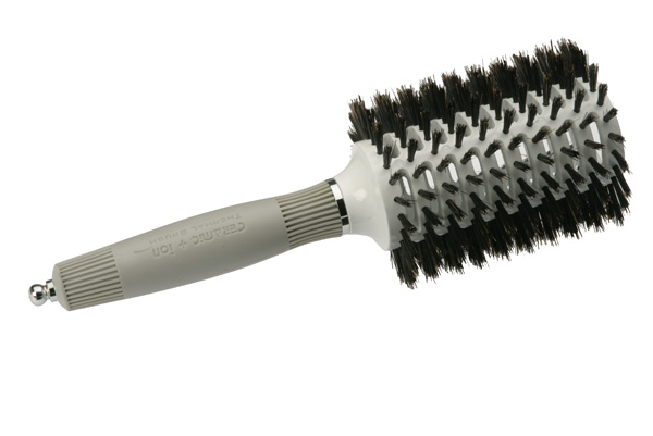 Брашинг Turbo Vent с керамической поверхностью, обогащённой отрицательно заряженными ионами, с натуральной щетиной дикого кабана. Удобная прорезиненная ручка оснащена специальным хвостиком для разделения и выделения прядей. Сквозные отверстия в керамическом корпусе щётки продуваются горячим воздухом фена и обеспечивают быстрое высыхание волос и прочность завитка. Диаметр 45 см.