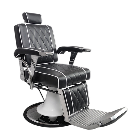 Барберское кресло «Джек» классическая модель с оригинальным дизайном. Ромбовидный орнамент с белым кантом в сочетании с белым колпаком, закрывающим гидравлику и с хромированные металическими деталями, выделяет это кресло среди других. Оно будет изыскано смотреться в Вашем барбершопе.