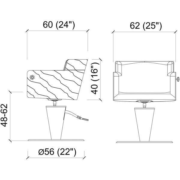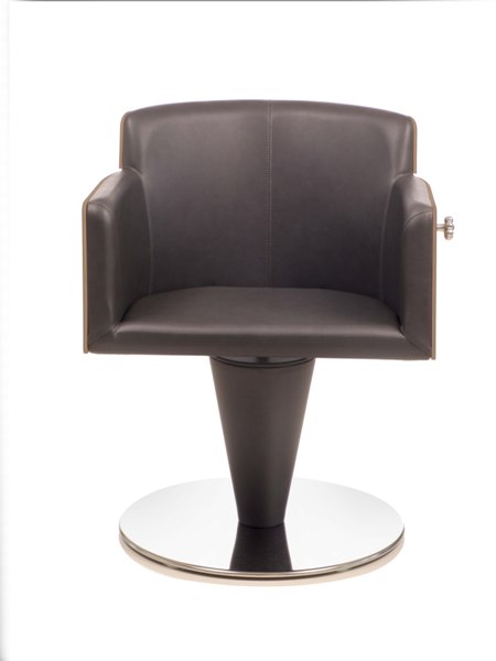 Дизайнерское парикмахерское кресло. Кресло для клиента комплектуется дисковым основанием из нержавеющей стали и гидроподъемником с блокировкой. Отделка каркаса кресла — ламинат «под дерево», отделка гидроподъемника — искусственная кожа. Кресло оснащено комфортными подлокотниками и декоративной ручкой для подвешивания сумок, обеспечивая клиенту максимальный комфорт. Обивка — искусственная кожа высшего качества.