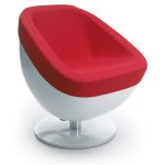 Кресло для клиента округлой формы, комплектуется металлическим дисковым основанием. Кресло оснащено белым лакированным каркасом. Обивка — искусственная кожа высшего качества.