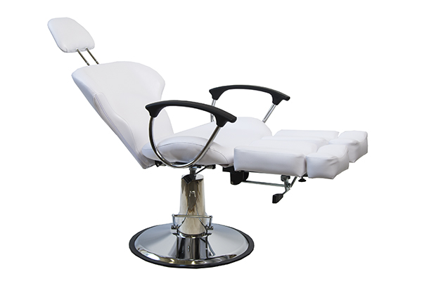 Эргономичное кресло для педикюрных процедур. Выдвижной подголовник и подножия. Черные пластиковые подлокотники. С помощью гидравлической колонны регулируется высота кресла (вверх-вниз). Изменение угла наклона спинки (вверх-вниз) производится вручную — пневматика. Изменение положения подножий производится вручную – механика. Цвет – белый. Габариты : Д 75*Ш 65* В 91 см.