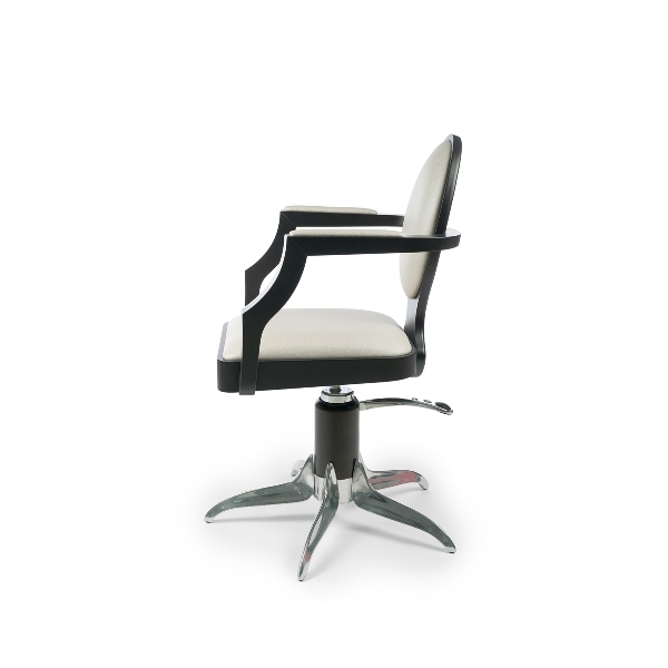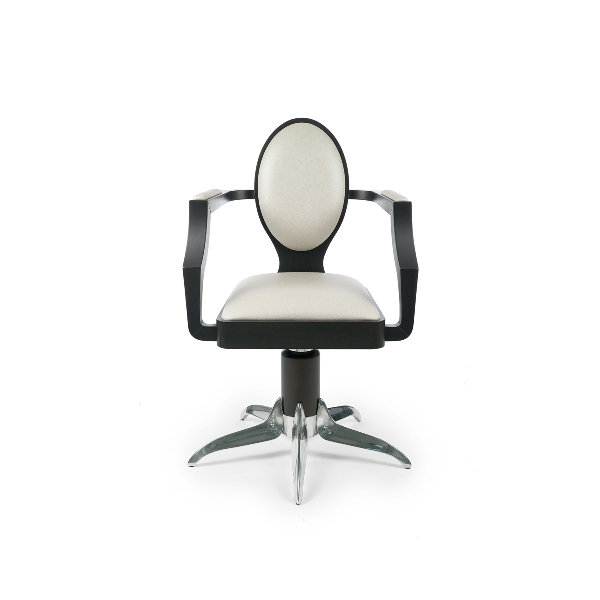 Дизайнерское парикмахерское кресло. Кресло для клиента комплектуется металлическим основанием. Кресло оснащено комфортными деревянными подлокотниками с накладками из исскуственной кожи. Каркас кресла выполнен из окрашенного дерева. Варианты цвета каркаса кресла на выбор: беленый дуб (FAGGIO SBIANCATO) или венге (FAGGIO TINTO EBANO). Обивка — искусственная кожа высшего качества.