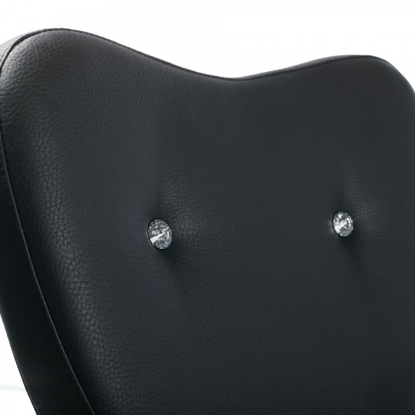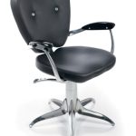 Дизайнерское парикмахерское кресло. Кресло для клиента комплектуется металлическим хромированным основанием в форме пятилучья и гидроподъемником с блокировкой. Кресло оснащено комфортными алюминиевыми подлокотниками с накладками из дерева. Обивка — искусственная кожа высшего качества.