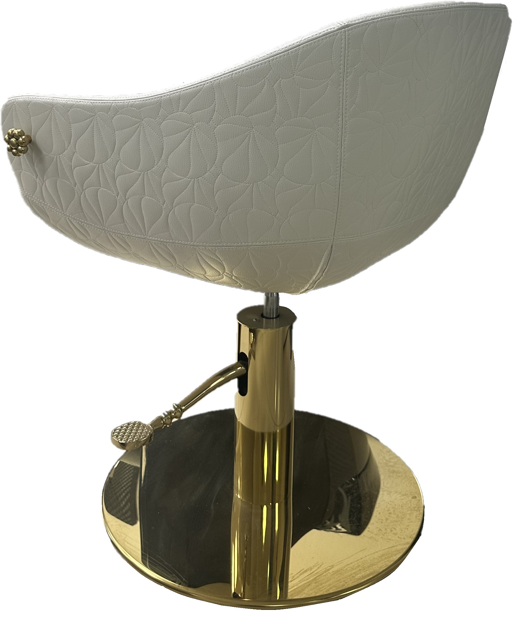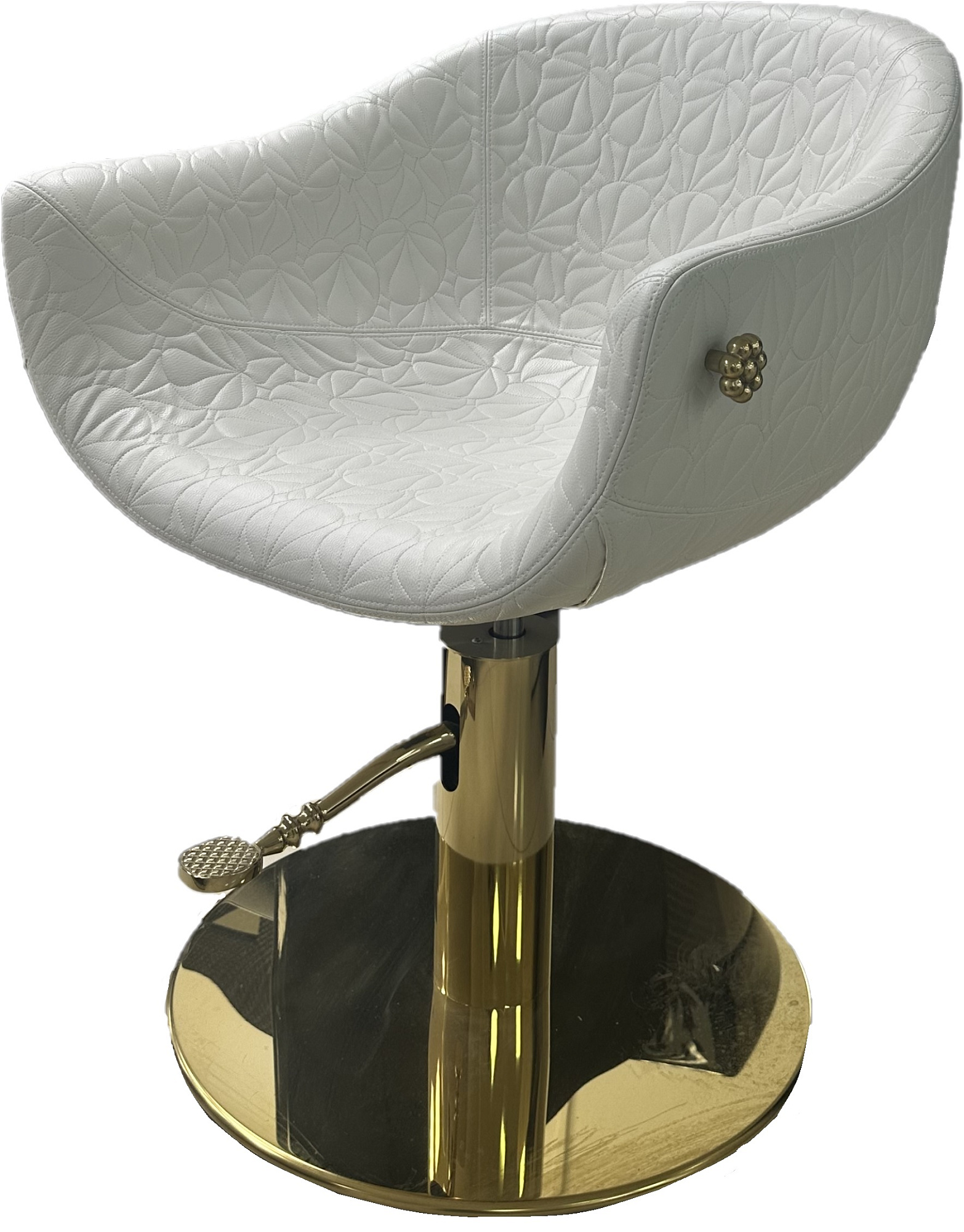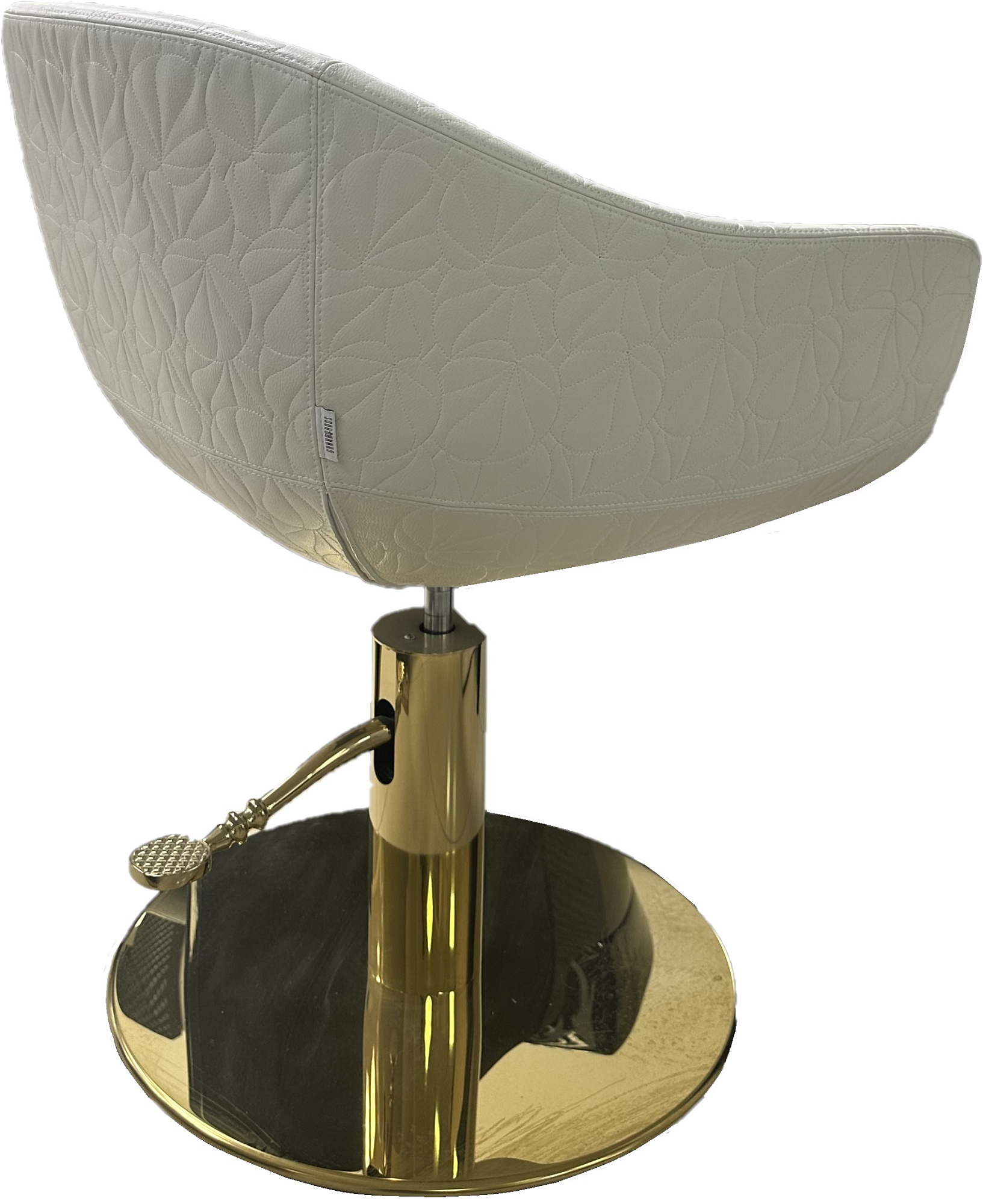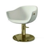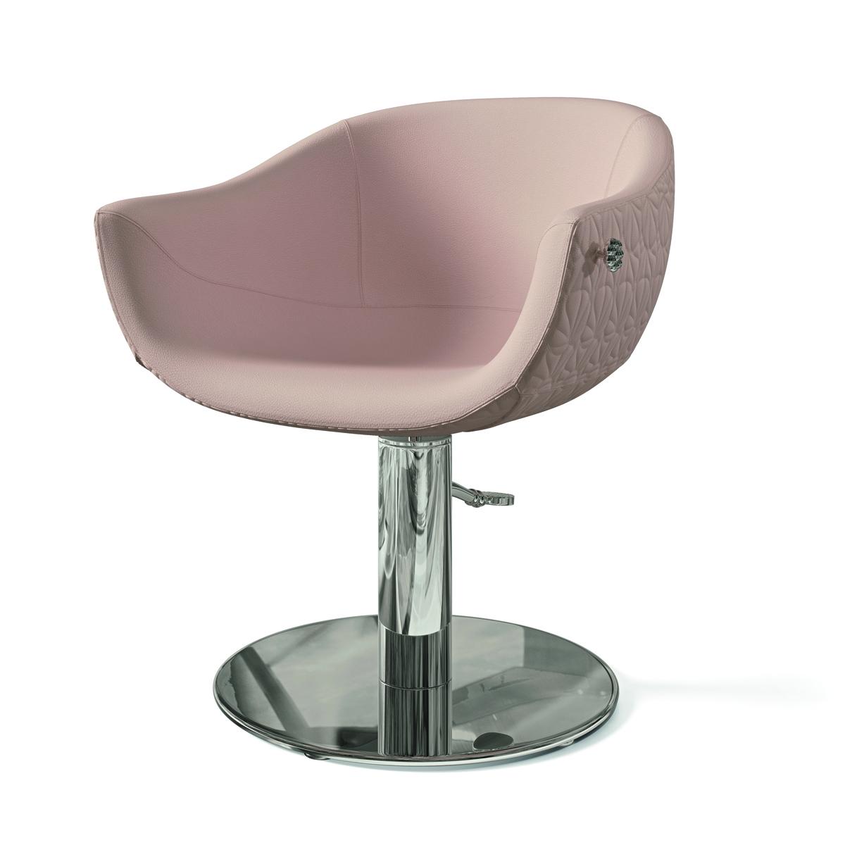 Дизайнерское парикмахерское кресло. Кресло для клиента комплектуется дисковым основанием из нержавеющей стали и гидроподъемником с блокировкой. Кресло оснащено комфортными подлокотниками и декоративной ручкой для подвешивания сумок, обеспечивая клиенту максимальный комфорт. Внешняя часть подлокотников и спинки может быть выполнена в кожзаме LOTUS SKAI (Белый WHITE, черный BLACK или розовый PINK). Обивка — искусственная кожа высшего качества.