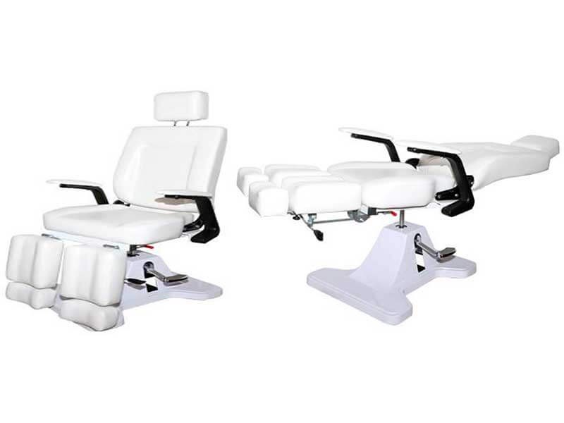 Четырехсекционное педикюрное кресло. Вращается вокруг оси на 360°. Раздвижные подножки. Подлокотники в цвет кресла. С помощью гидравлики регулируется высота кресла (вверх-вниз). Выдвижной подголовник и подножия.