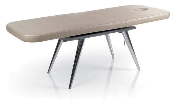 Кушетка массажная прямоугольной формы. Кушетка оснащена механическим механизмом регулировки наклона спинки и матрасом с отверстием для лица. Каркас кушетки, изготовленный из металла, обеспечивает высокое качество и прочность. Обивка — искусственная кожа высшего качества.