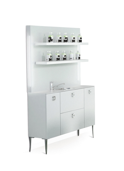 Лаборатория оснащена двумя навесными полками, выдвижными ящиками, дверцами, металлическими ножками и водонепроницаемой столешницей с интегрированной раковиной из нержавеющей стали со смесителем. Лаборатория выполнена в ламинате (только в этих цветах): черный (U 007 NERO), белый (BIANCO 003).