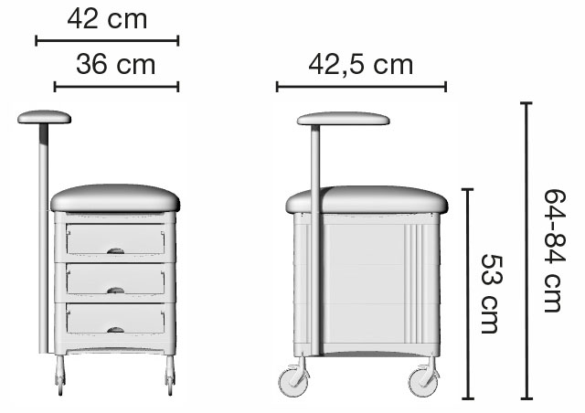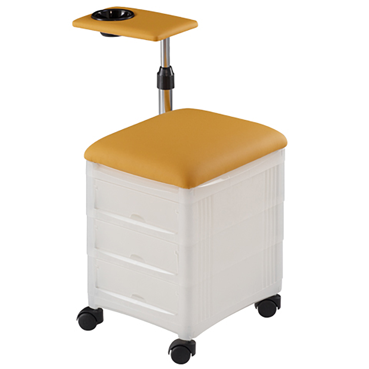 Стойка маникюрная на колесиках. Стойка маникюрная оснащена тремя выдвижными ящиками закрытого типа и специальной полочкой, которая регулируется по высоте. Каркас стойки выполнен из прочного пластика, мягкий элемент сиденья и рабочей полочки выполнен из искусственной кожи высшего качества.