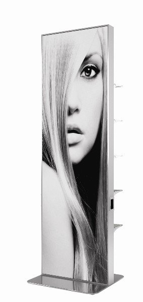 Вариант 1 — Двухсторонний рабочий туалет, крепление к полу. С одной стороны парикмахерское зеркало со столешницей и металлической подставкой для ног. С другой стороны витрина со стекляными полками и выбранным клиентом изображением.