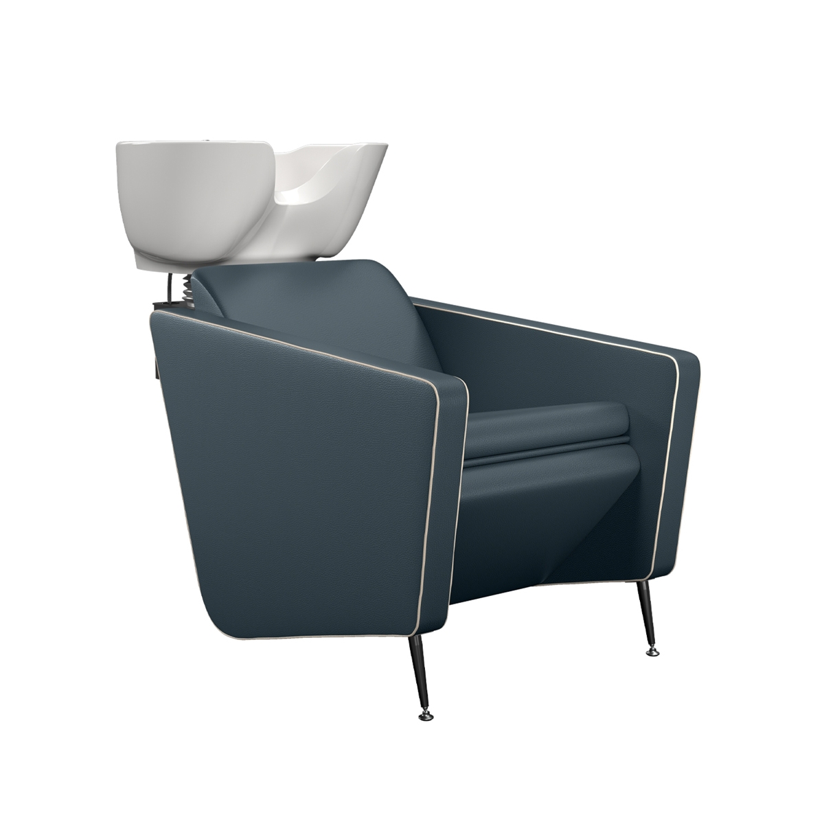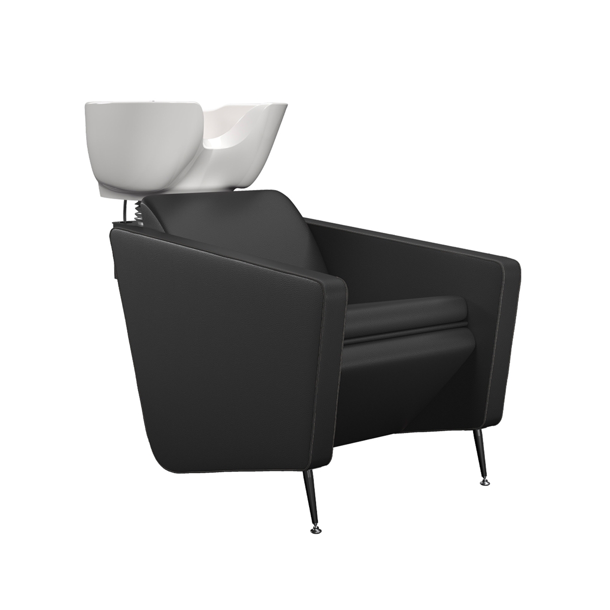 Парикмахерская мойка. Мойка оснащена металлическим каркасом черного цвета, мягкими и комфортными подлокотниками, ножками из полированного алюминия. Мойка комплектуется глубокой керамической раковиной с регулировкой угла наклона и комплектом смесителя. Обивка — искусственная кожа высшего качества.