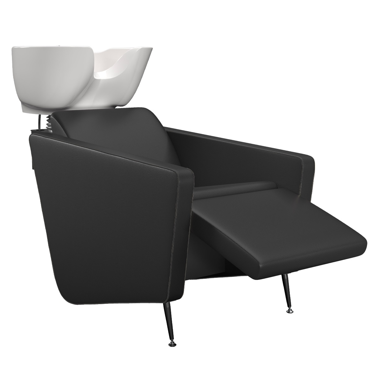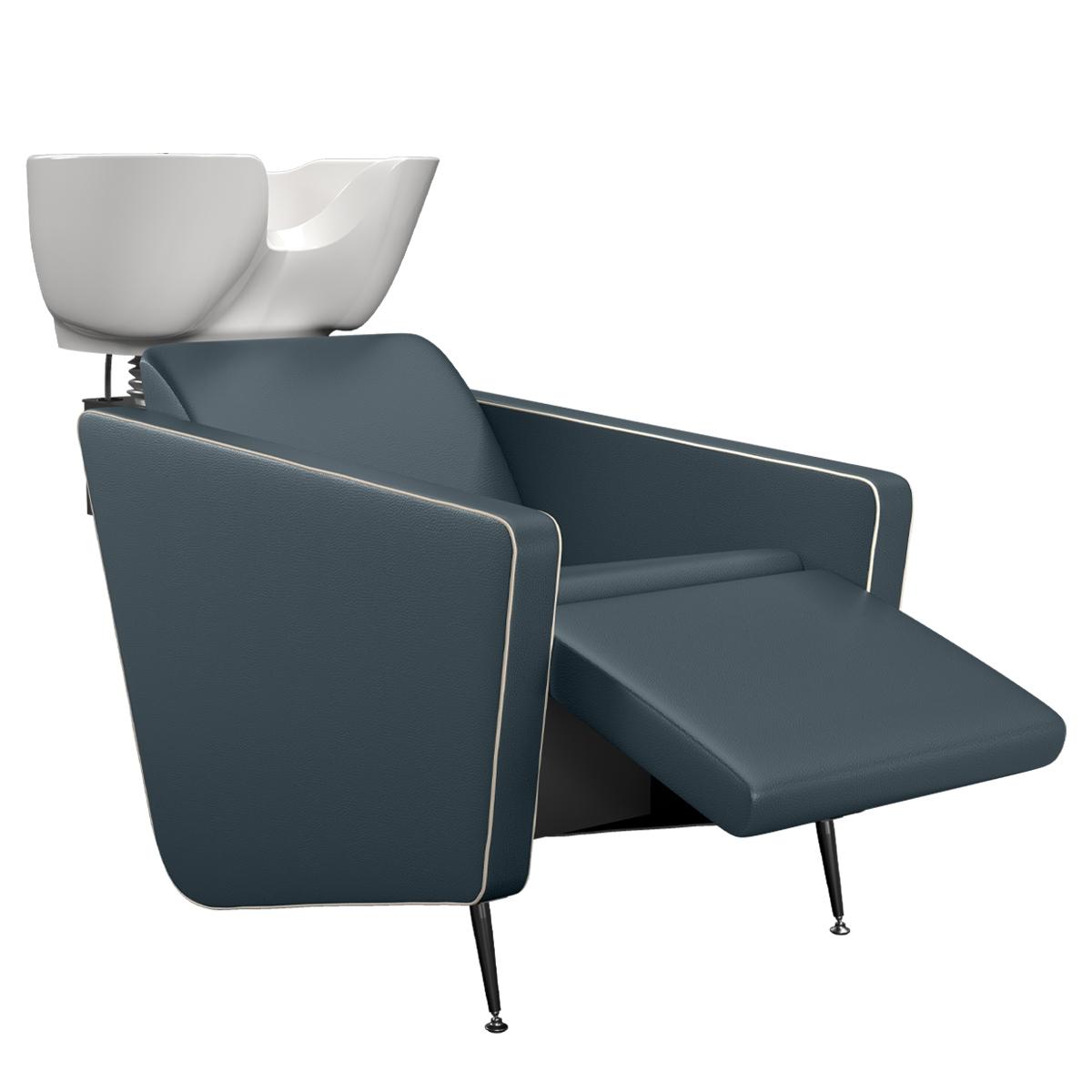 Парикмахерская мойка. Мойка оснащена металлическим каркасом черного цвета, мягкими и комфортными подлокотниками, ножками из полированного алюминия и электрической подножкой, что позволяет клиенту принять положение «полулежа» обеспечивая максимальный комфорт. Мойка комплектуется глубокой керамической раковиной с регулировкой угла наклона и комплектом смесителя. Обивка — искусственная кожа высшего качества.