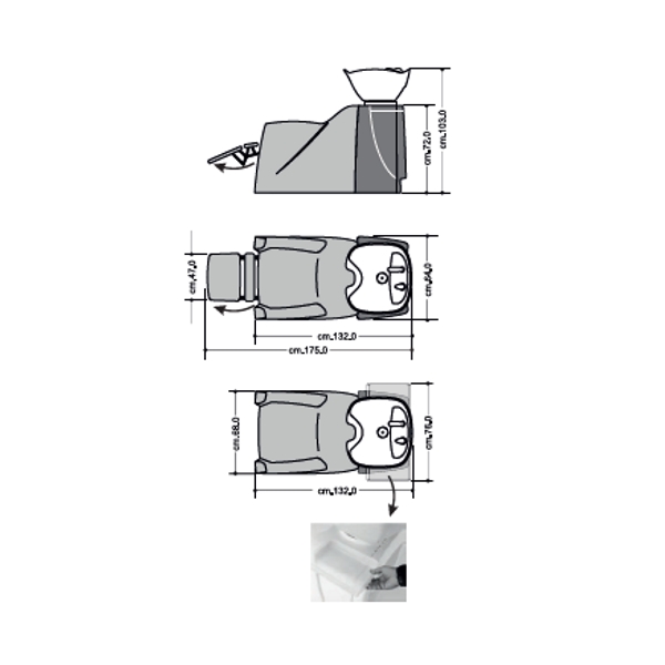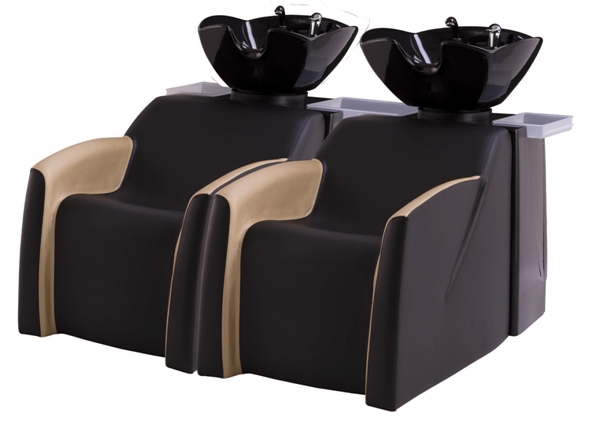 Мойка парикмахерская. Мойка оснащена пластиковым каркасом с нишей для хранения инструментов и двумя боковыми навесными полками. Кресло оснащено мягкими и комфортными подлокотниками. Мойка комплектуется глубокой керамической раковиной с регулировкой угла наклона и комплектом смесителя. Обивка — искусственная кожа высшего качества.