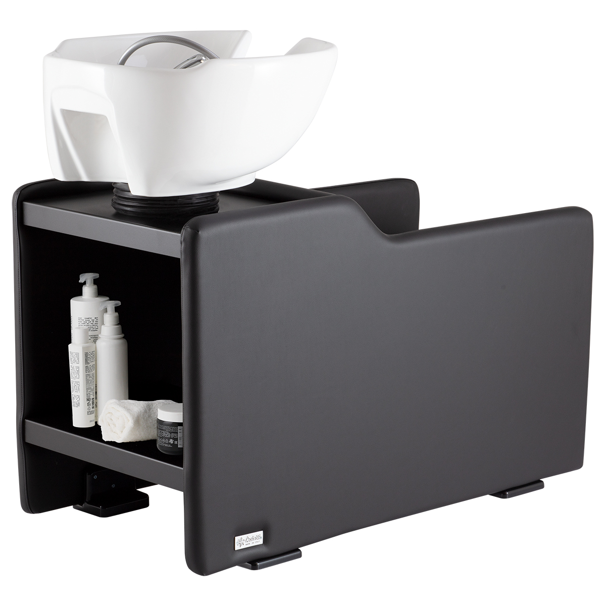 Мойка парикмахерская. Каркас, сиденье и спинка выполнены из высококачественного вспененного полиуретана с вставками из дерева и металла. Кресло оснащено мягкими и комфортными подлокотниками. Мойка оснащена металлическими столешницей и полкой для хранения инструментов. Мойка комплектуется глубокой керамической раковиной с регулировкой угла наклона и комплектом смесителя. Обивка — искусственная кожа высшего качества.