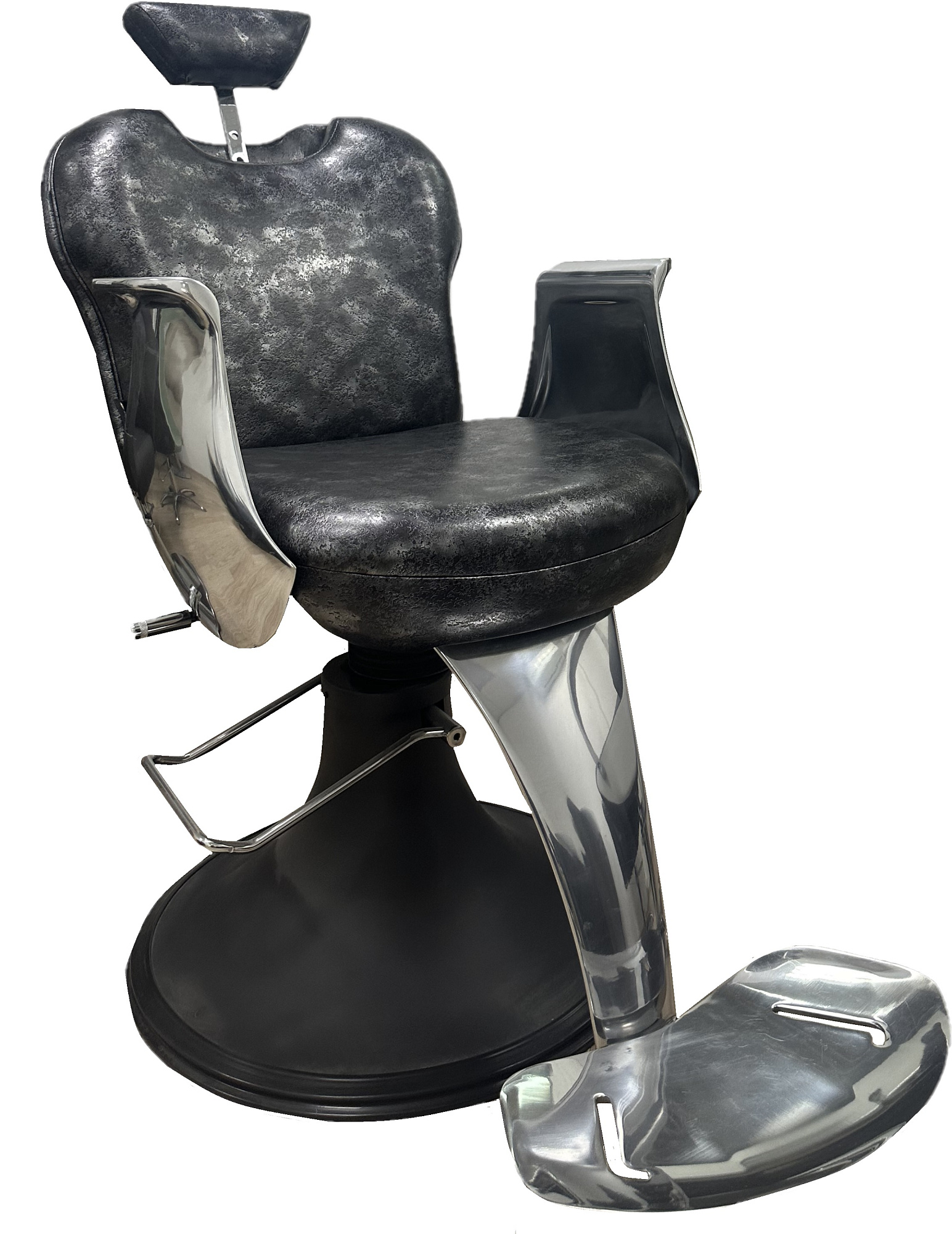 Кресло для клиента – мужское, на гидравлике с блокировкой на диске. Каркас кресла изготовлен из многослойной фанеры, выполнен из высококачественного полиуретана. Кресло оснащено хромированными подлокотниками и подставкой для ног из литого алюминия, регулируемой спинкой и регулируемым по высоте подголовником. Обивка — искусственная кожа высшего качества.