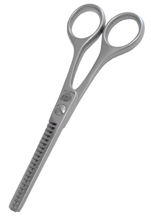 Ножницы филировочные (20 зубцов) Professional 5,5″ классической формы с двухсторонней филировкой. Цельнометаллические ножницы из итальянской стали имеют ограничитель и усилитель хода, регулируемый винт и сменные кольца (регуляторы размера из мягкого пластичного материала), что делает наиболее удобным использование ножниц и предотвращают возможность аллергии.