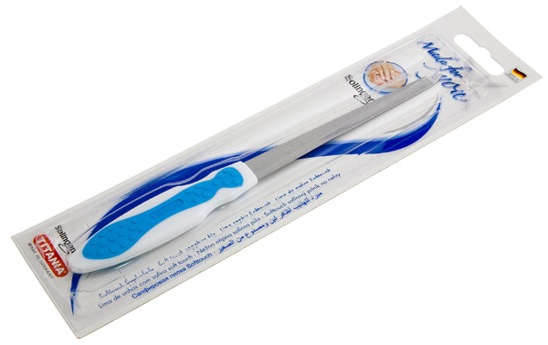 Пилка 20 см алмазная из хромированной пружинной стали, с нескользящей рукояткой эгрономичной формы, с микросапфировым напылением. Две степени зернистости — мелкая и крупная — обеспечивают обработку ногтей щадящим образом, предотвращая сколы и расслоение ногтей.