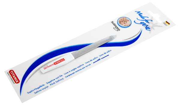 Пилка 12,5 см вогнутая с микросапфирным напылением и пластиковой ручкой, снабжённой сдвигателем кожи. Для удобства использования пилочка имеет две рабочие поверхности с крупным и мелким напылением.