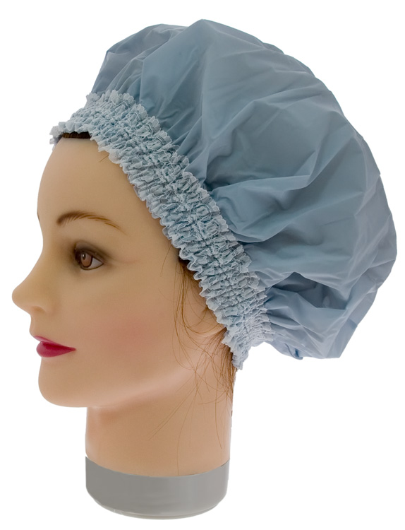 Пластиковая шапочка голубая для душа с широкой эластичной лентой.
