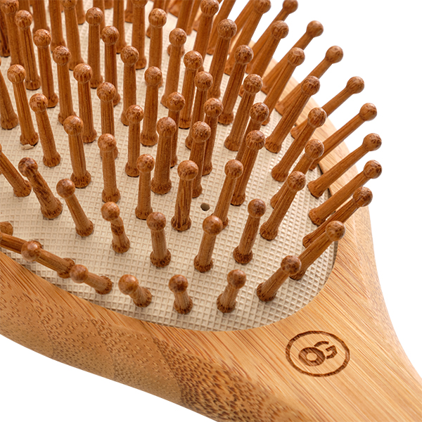 Щетка для волос массажная из бамбука средняя. Закруглённые деревянные штифты в сочетании с упругой подушкой обеспечивают комфортное расчёсыване волос и бережный массаж кожи головы.