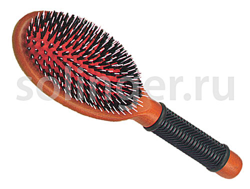 Щетка на деревянной основе с натуральной щетиной и нейлоновыми штифтами.Рифленая ручка из натурального каучука.Натуральная щетина бережно взаимодействует с волосами. Придает естественный блеск.Нейлоновые штифты для лучшего расчесывания, разглаживания и придания блеска волосам.