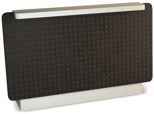 Стойка администратора прямоугольной формы с декоративной отделкой фасада из искусственой кожи черного цвета (NERO CPT — стеганный). Корпус и наполнение выполнены в ламинате белого или черного цвета. Обивка — искусственная кожа высшего качества.