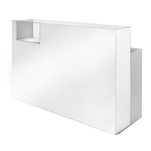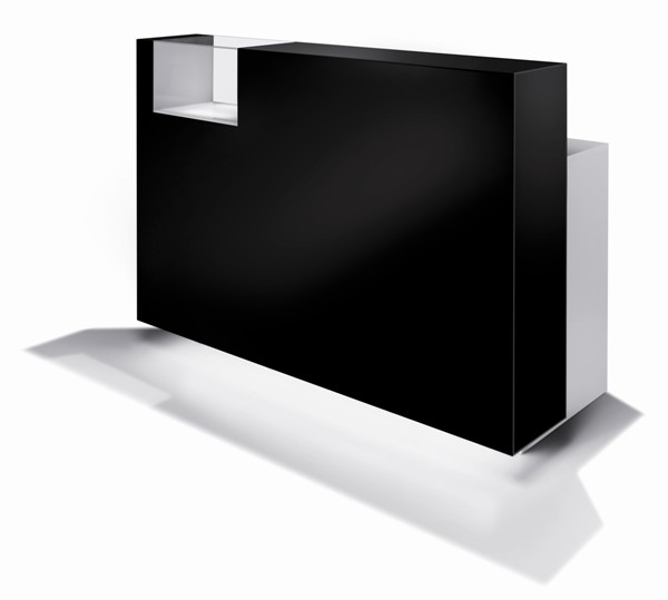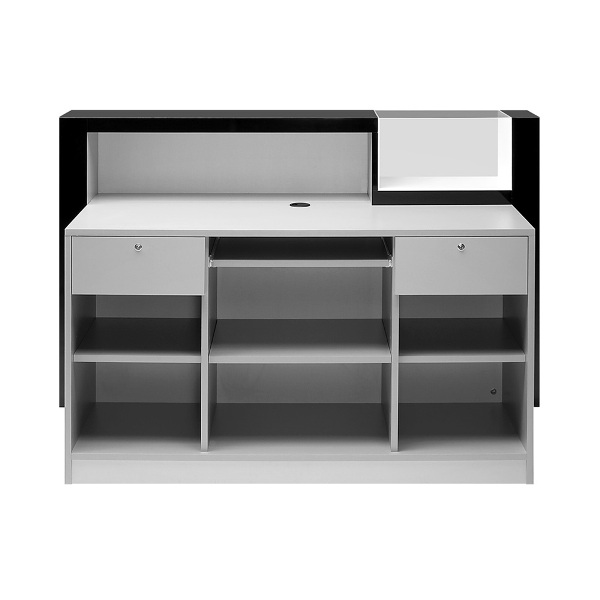 Стойка администратора, фасад выполнен из глянцевого ламината белого или черного цвета. Стойка администратора оснащена встроенной витриной с подсветкой, двумя выдвижными ящиками, полкой для клавиатуры и полками для хранения. Корпус и наполнение выполнены в ламинате серого цвета.