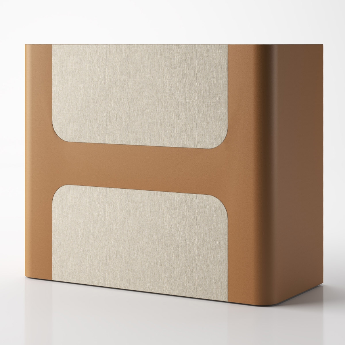 Стойка администратора прямоугольной формы с декоративной отделкой фасада из искусственой кожи. Корпус и наполнение выполнены в ламинате. Обивка — искусственная кожа высшего качества. Длина 150 см.