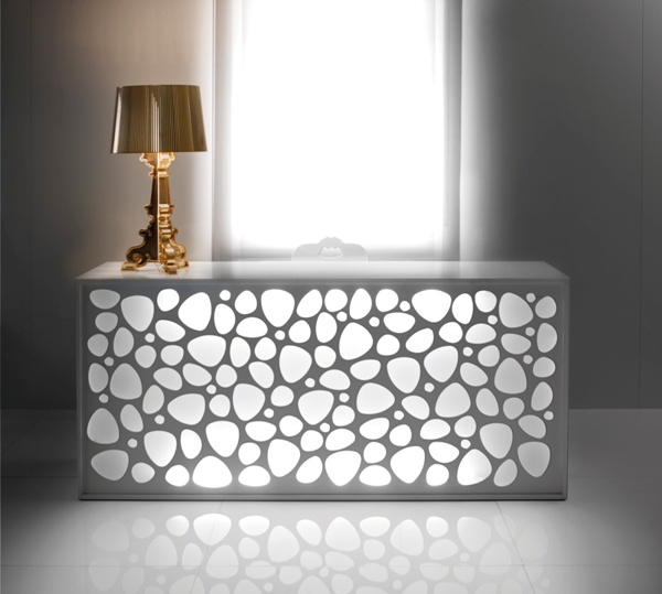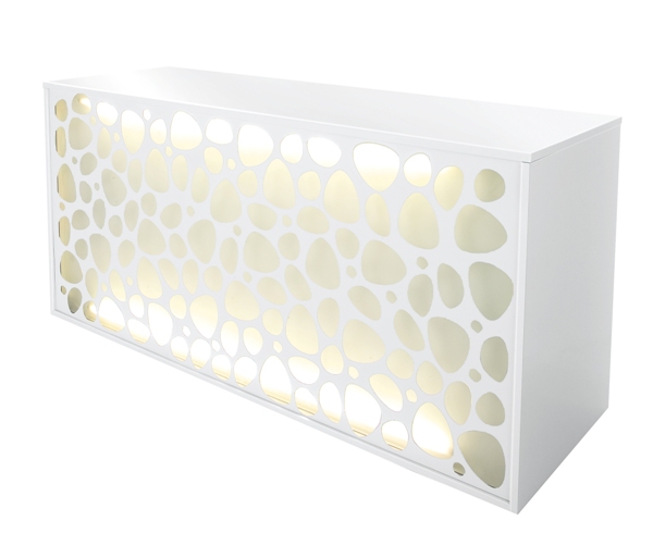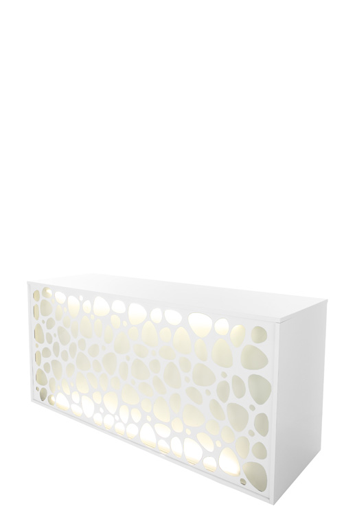 Стойка администратора оснащена подсветкой, двумя выдвижными ящиками, полкой и нишей для хранения. Корпус и наполнение выполнены в ламинате, фасад стойки из белого оргстекла.