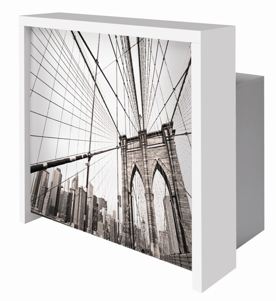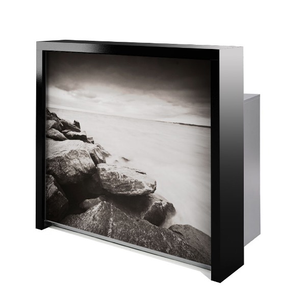 Стойка администратора, фасад выполнен из оргстекла с подсветкой и выбранным клиентом изображением, с рамой из глянцевого ламината белого или черного цвета. Корпус и наполнение выполнены в ламинате серого цвета.