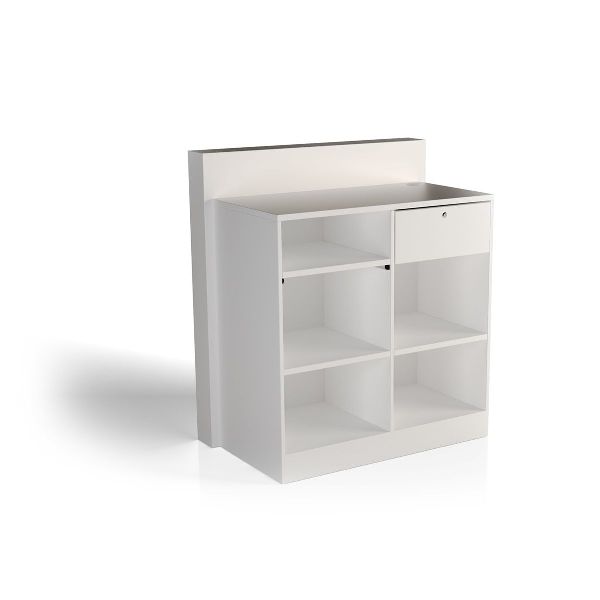 Стойка администратора классического дизайна. Корпус и наполнение выполнены в ламинате. Фасад выполнен в белом алюминиевом цвете, корпус и наполнение выполнены в белом или черном ламинате. Стойка администратора оснащена выдвижным ящиком и двумя нишами для хранения. Длина 90 см.