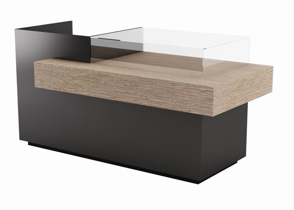 Стойка администратора, фасад выполнен из глянцевого ламината белого или черного цвета. Центральная консоль выполнена в ламинате. Стойка администратора оснащена встроенной витриной для косметических продуктов, тремя выдвижными ящиками и полками для хранения.