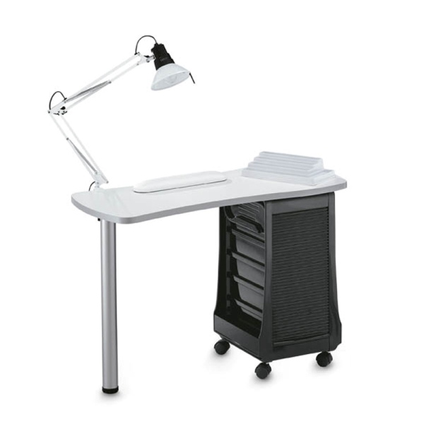 Маникюрный стол с одной тумбой, столешница из дерева, тумба из пластика. Кромка столешницы серого цвета. Опорная нога серая глянцевая. Тумба маникюрного стола оснащена четырьмя выдвижными ящиками, закрывающейся пластиковой шторкой и колесами для удобства перемещения. В комплекте: валик маникюрный, подставка под лаки.