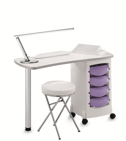 Маникюрный стол с одной тумбой, столешница из дерева, тумба из пластика. Кромка столешницы серого цвета. Опорная нога серая глянцевая. Тумба маникюрного стола оснащена четырьмя выдвижными ящиками и колесами для удобства перемещения. В комплекте: валик маникюрный, подставка под лаки.