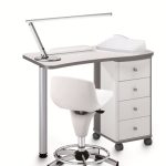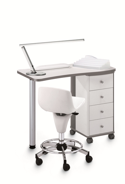 Маникюрный стол с одной тумбой, столешница и тумба из дерева. Тумба маникюрного стола имеет серые вставки, кромка столешницы серого цвета. Опорная нога серая глянцевая. Тумба маникюрного стола оснащена четырьмя выдвижными ящиками и колесами со стопорами для удобства перемещения. В комплекте: валик маникюрный, подставка под лаки.