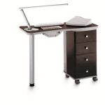 Маникюрный стол с одной тумбой, столешница и тумба из дерева. Тумба маникюрного стола имеет серые вставки, кромка столешницы серого цвета. Опорная нога серая глянцевая. Тумба маникюрного стола оснащена четырьмя выдвижными ящиками и колесами со стопорами для удобства перемещения. В комплекте: валик маникюрный, подставка под лаки, вытяжка AR1 20W.