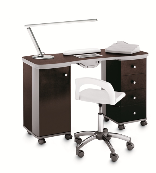 Маникюрный стол с двумя тумбами, столешница и тумбы из дерева. Тумбы маникюрного стола имеют серые вставки, кромка столешницы серого цвета. Одна тумба маникюрного стола оснащена четырьмя выдвижными ящиками, другая тумба оснащена распашной дверцей и полками. Тумбы маникюрного стола имеют колеса со стопорами для удобства перемещения. В комплекте: валик маникюрный, подставка под лаки, вытяжка AR1 20W.