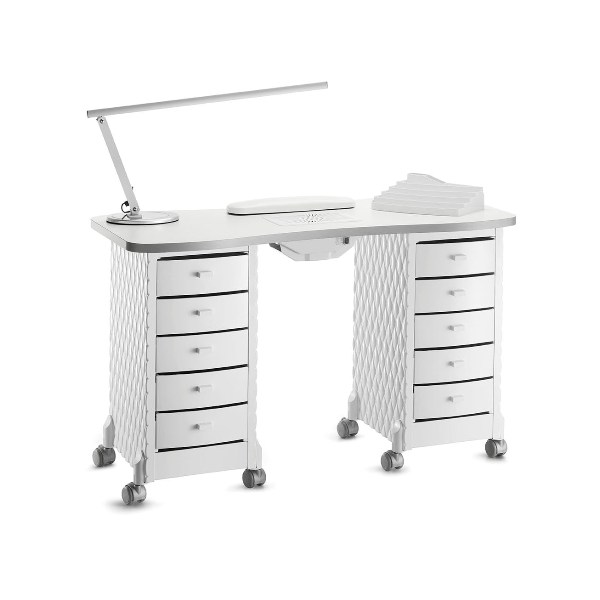 Маникюрный стол с двумя тумбами, столешница ламинированная, тумбы из прочного пластика с декоративной стеганой отделкой боковин. Тумбы маникюрного стола оснащены пятью выдвижными ящиками и колесами со стопорами для удобства перемещения. В комплекте: валик маникюрный, подставка под лаки, вытяжка AR1 20W.