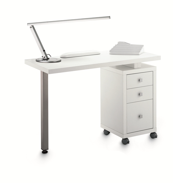 Маникюрный стол с одной тумбой, столешница и тумба из дерева. Тумба маникюрного стола оснащена тремя выдвижными ящиками и колесами со стопорами для удобства перемещения. В комплекте: валик маникюрный, подставка под лаки.