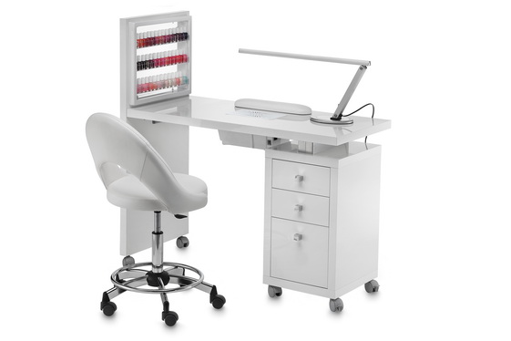 Маникюрный стол с одной тумбой. Маникюрный стол оснащен витриной с тремя полками из оргстекла. Витрина имеет размер 41×35 см и позволяет разместить около 40 флаконов. Тумба маникюрного стола оснащена тремя выдвижными ящиками и колесами со стопорами для удобства перемещения. В комплекте: валик маникюрный, подставка под лаки, вытяжка AR5 Superturbo 60W.