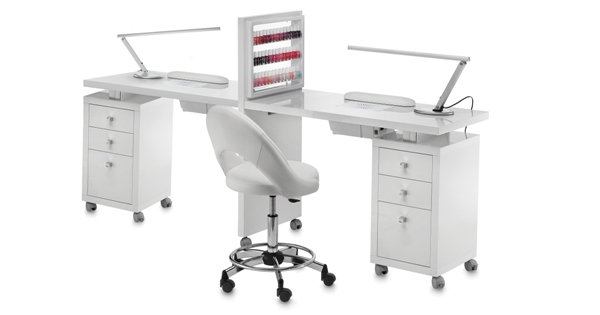 Маникюрный стол с двумя тумбами на два рабочих места. Маникюрный стол оснащен двусторонней витриной с тремя полками из оргстекла. Доступ для лаков и инструментов есть у каждого мастера. Витрина имеет размер 41×35 см и позволяет разместить около 40 флаконов. Тумбы маникюрного стола оснащены тремя выдвижными ящиками и колесами со стопорами для удобства перемещения. В комплекте: валики маникюрные, подставки под лаки, вытяжки AR5 Superturbo 60W.