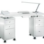 Маникюрный стол с двумя тумбами, столешница и тумбы из дерева. Тумбы маникюрного стола оснащены тремя выдвижными ящиками и колесами со стопорами для удобства перемещения. В комплекте: валик маникюрный, подставка под лаки, вытяжка AR5 Superturbo 60W.