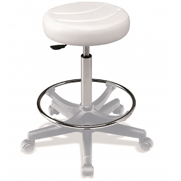 Высокий стул мастера 021, оснащен опорой для ног в виде кольца, пластиковым пятилучьем на колесах и газлифтом для регулировки высоты. Посадочное место – круглое.