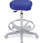 Высокий стул мастера 035, оснащен опорой для ног в виде кольца, пластиковым пятилучьем на колесах и газлифтом для регулировки высоты. Посадочное место – в форме седла.