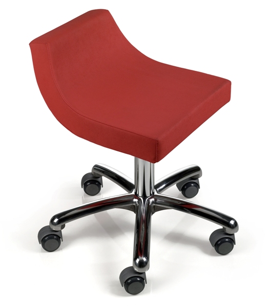 Низкий стул для мастера. Стул оснащен алюминиевым основанием в форме пятилучья с колесами и газлифтом для регулировки высоты. Рекомендован в кабинет педикюра. Обивка — искусственная кожа высшего качества.