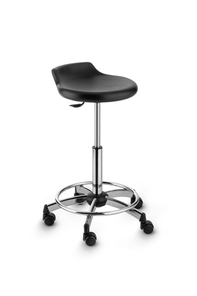 Высокий стул мастера. Стул оснащен алюминиевым основанием в форме пятилучья с опорой для ног, колесами и газлифтом для регулировки высоты.