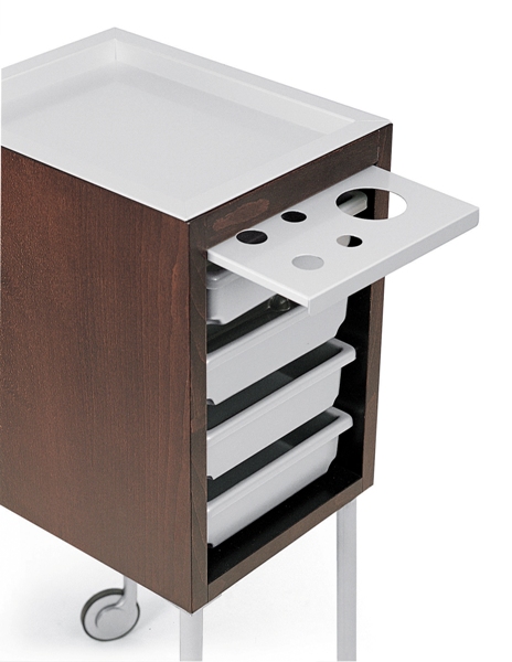 Тележка парикмахерская из дерева, ламината или акрила. Тележка оснащена выдвижными ящиками, фенодержателем, алюминиевым покрытием сверху тележки для использования горячих инструментов и колесиками.