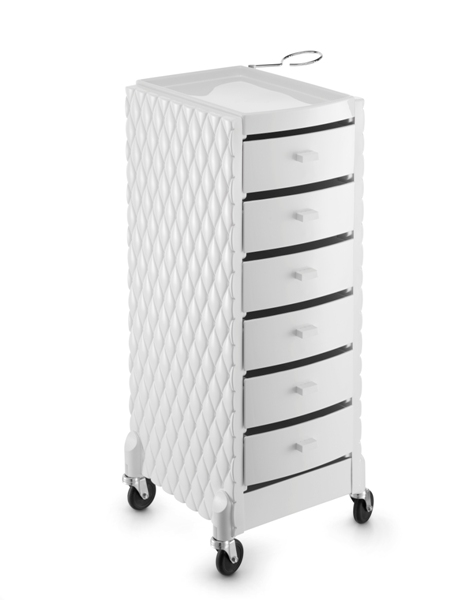 Тележка парикмахерская выполнена из прочного пластика с декоративной стеганой отделкой боковин. Тележка оснащена шестью выдвижными ящиками закрытого типа, вращающимся фенодержателем и прорезиненными колесами.