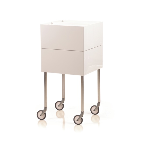Тележка многофункциональная с раздвижной верхней частью. Корпус тележки выполнен в ламинате белого цвета. Тележка оснащена колесиками.