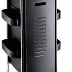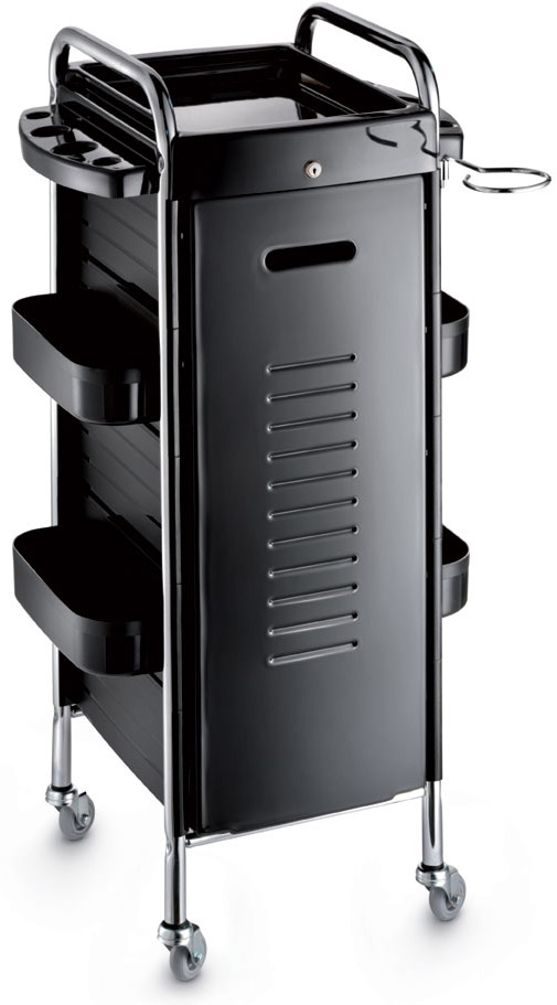 Тележка парикмахерская закрытого типа на хромированном каркасе из прочного пластика с пятью выдвижными ящиками. Оснащена прорезиненными колесами для комфортного и бесшумного перемещения, металлическим фенодержателем, боковыми полками с отделениями для сопутствующих аксессуаров, а также четырьмя съёмными лотками, которые регулируются по высоте. Тележка закрывается противоскользящей панелью с ключом.